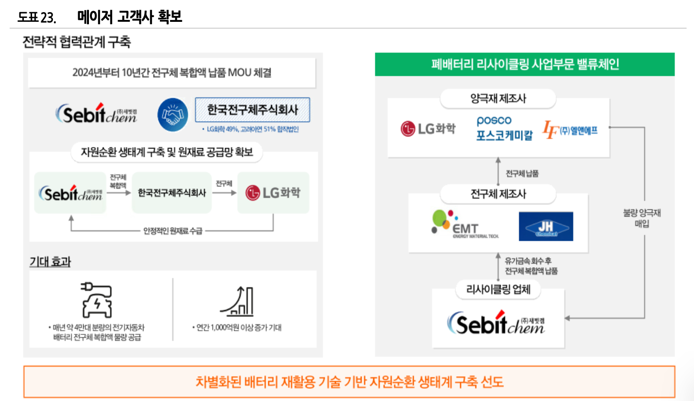 새빗켐은 올해 3월 LG화학으로부터 전구체 복합액의 납품을 승인받았다. 또한 LG 화학과 고려아연의 합작법인인 한국전구체주식회사와 2024년부터 10년간 전구체 복합앱을 공급하는 MOU를 체결했다. LG화학으로부터 재활용 양극재를 공급받아 동사가 한국전구체주식회사에 전구체 복합액을 공급하면 이를 다시 LG화학에 공급하는 구조이다.