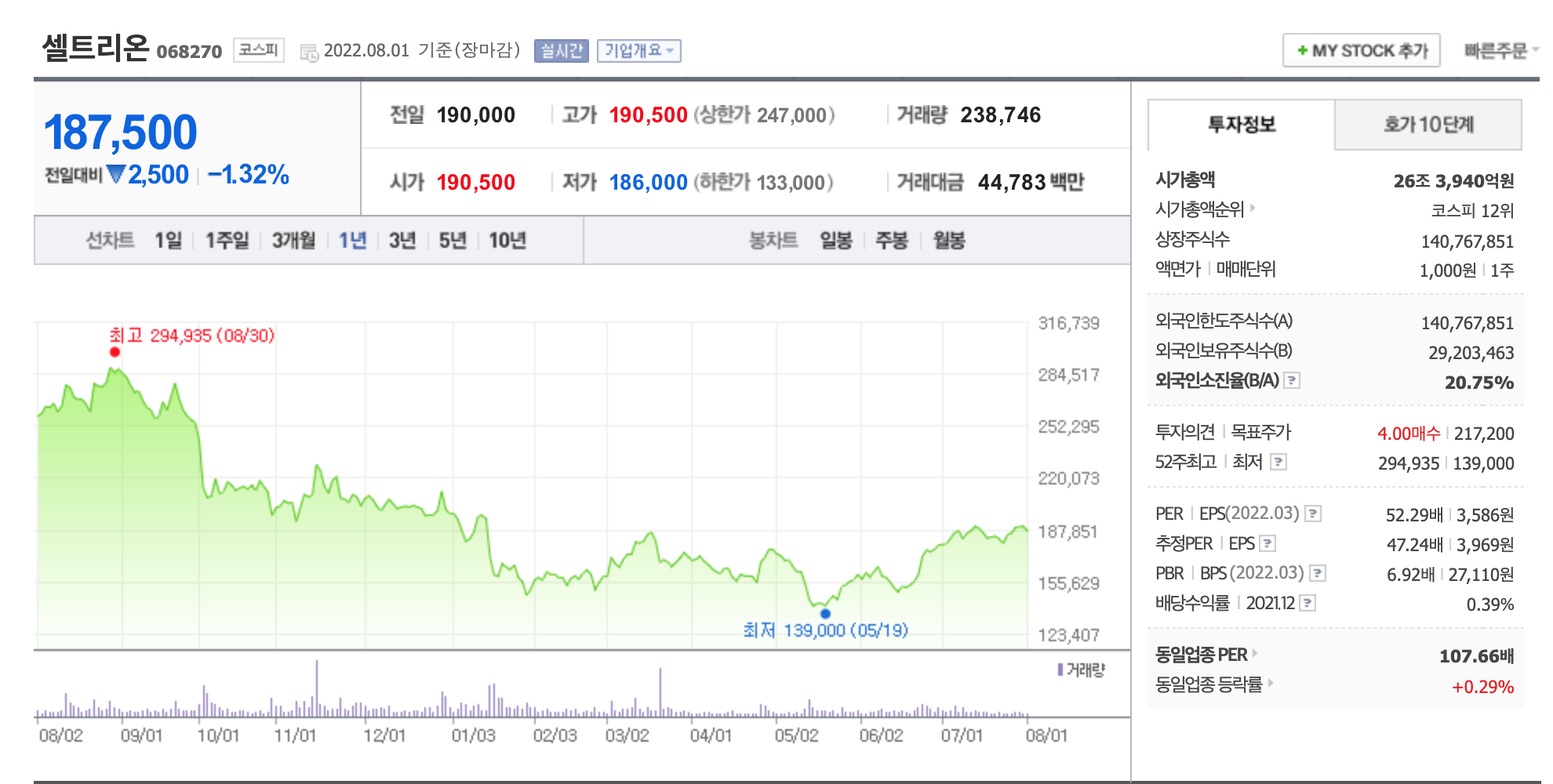 셀트리온그룹의 상장사는 셀트리온 3형제로 대표적인 셀트리온, 셀트리온헬스케어, 셀트리온제약 등이 있으나 각각 26조원, 11조원, 3조원에 달하는 매우 큰 회사라 모범가족 흥행이 주가에 긍정적 영향을 끼치기에는 어렵지 않을까 생각한다.