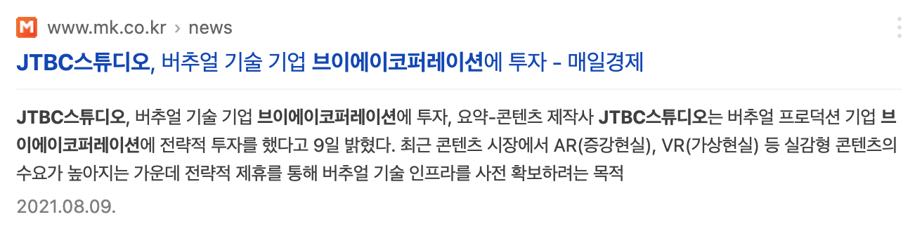 끝으로 브이에이코퍼레이션 시리즈A 투자에 NHN, LG전자, 펄어비스 3개회사도 참여했지만 서울대작전 관련주로 분류하지 않은 이유는 NHN의 경우 1조가 넘는 중대형 지주회사 성격이 강한 종목인과 동시에 클라우드스토리지 개발 쪽이라 미디어 사업과 멀다고 느껴서 배제하였고 LG전자의 경우 시총이 15조가 넘는 초대형주라 서울대작전 흥행이라는 작은(?) 호재에 반응하기 어려워서 배제하였다. 펄어비스 또한 3조 6천억이 넘어가는 대형회사인 이유와 브이에이코퍼레이션과 IP 에셋 라이브러리 공동 구축을 위해 투자한 이력이라 미디어 사업과 거리가 멀기에 배제하였다.