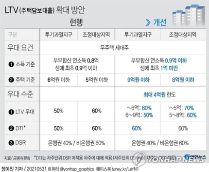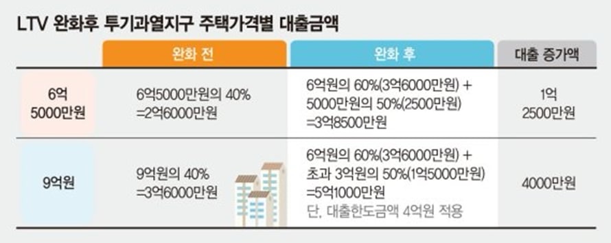 투기지역·투기과열지구에서 LTV의 경우 6억원 이하에 60%, 6억∼9억원 구간의 초과분에 50%를 각각 적용한다.