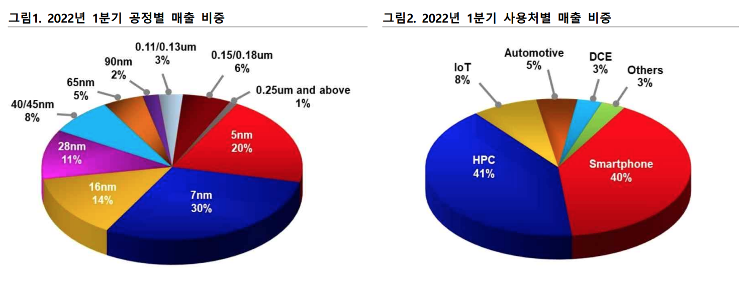 22년 1분기 기준 매출 비중은 HPC 41%, 스마트폰 40%, IoT 8%이다. 특히, 서버용, PC용, 5G칩 등에 대한 수요가 증가함에 따라 7nm 생산 칩의 매출이 급상승하고 있다.