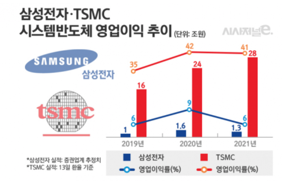 TSMC의 시스템 반도체 부문 영업이익은 28조원 영업이익률은 41%에 달한다. 그에 반해 삼성전자는 영업이익 1.3조원 영업이익률은 6%로 TSMC에 비해 많은 차이를 보이고 있다.