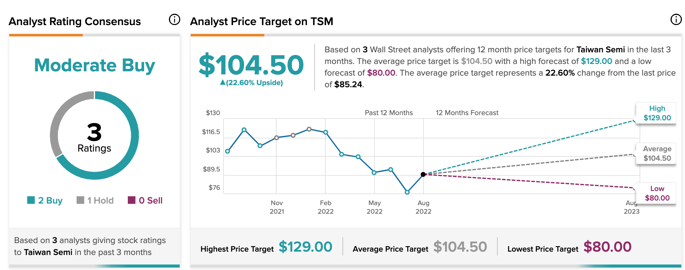 tsmc 주가에 의견을 제시한 애널리스트들의 평균 목표주가는 $104.5이며 최고가는 $129 최저가는 $80이다.