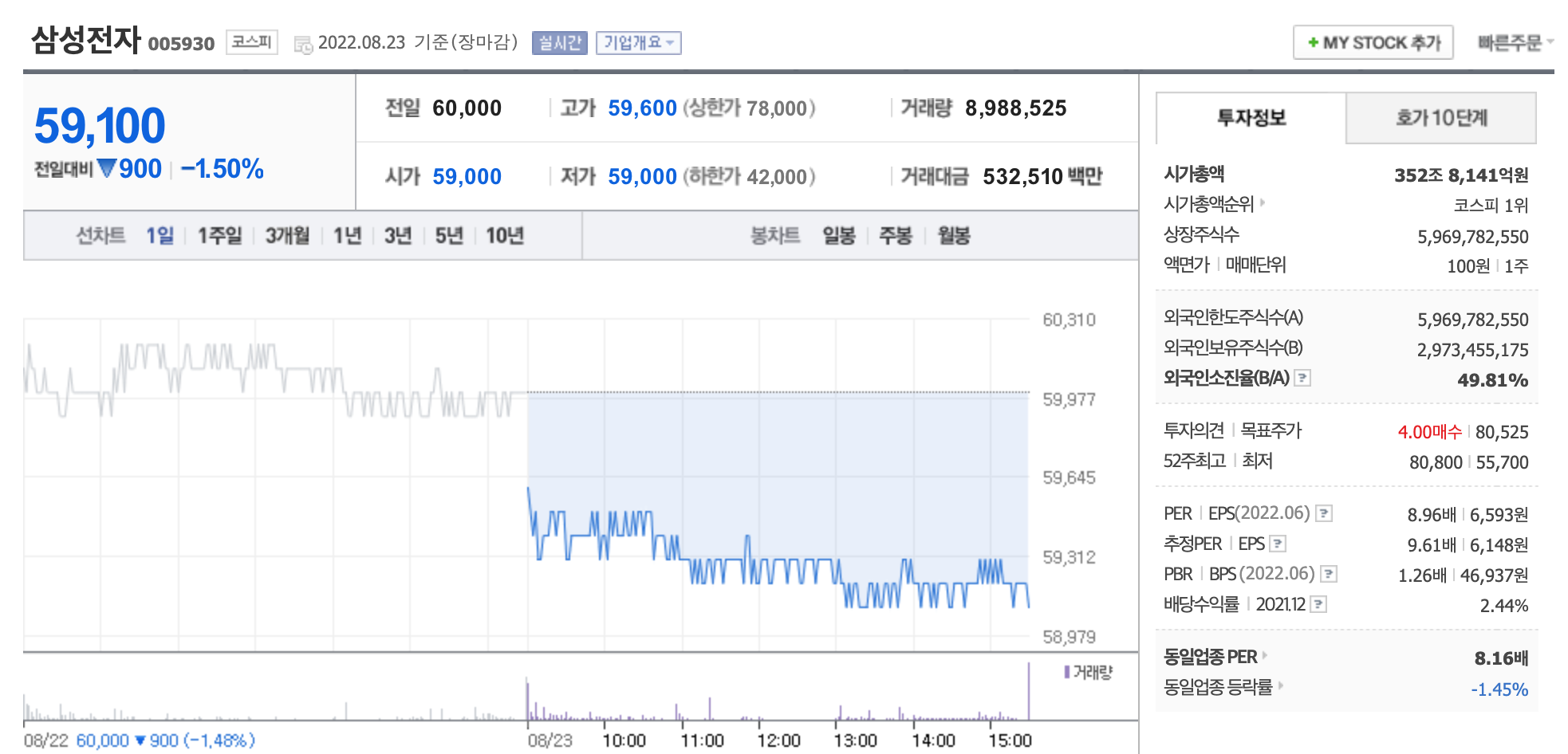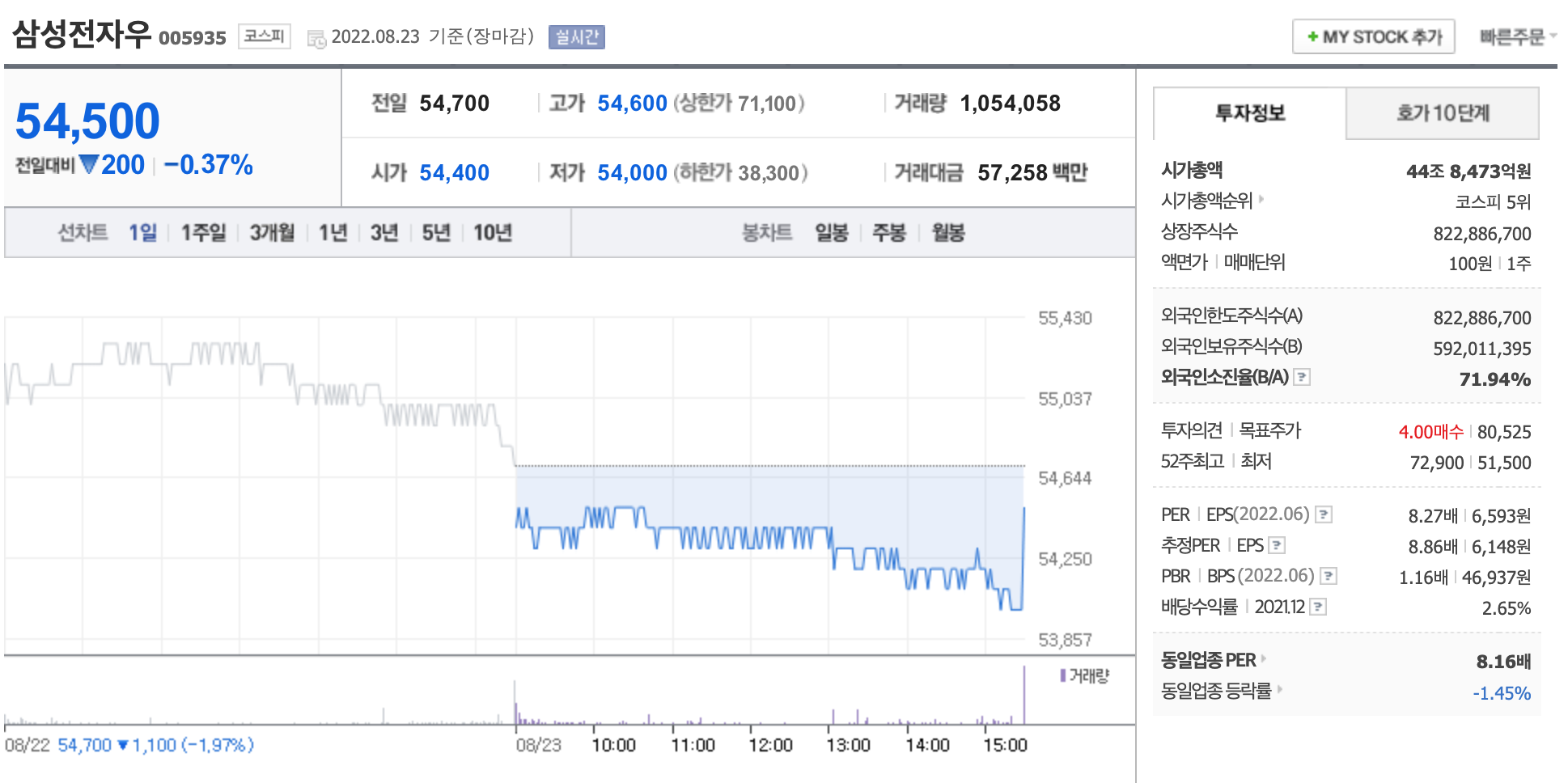현재 삼성전자의 배당수익률은 2.44%, 삼성전자 우의 배당수익률은 2.65%이다. 한국 중앙은행 기준금리 2.25%까지 올라온 지금 시장의 예적금 이자와 비슷해 배당주로써의 매력이 떨어진 상황이다.