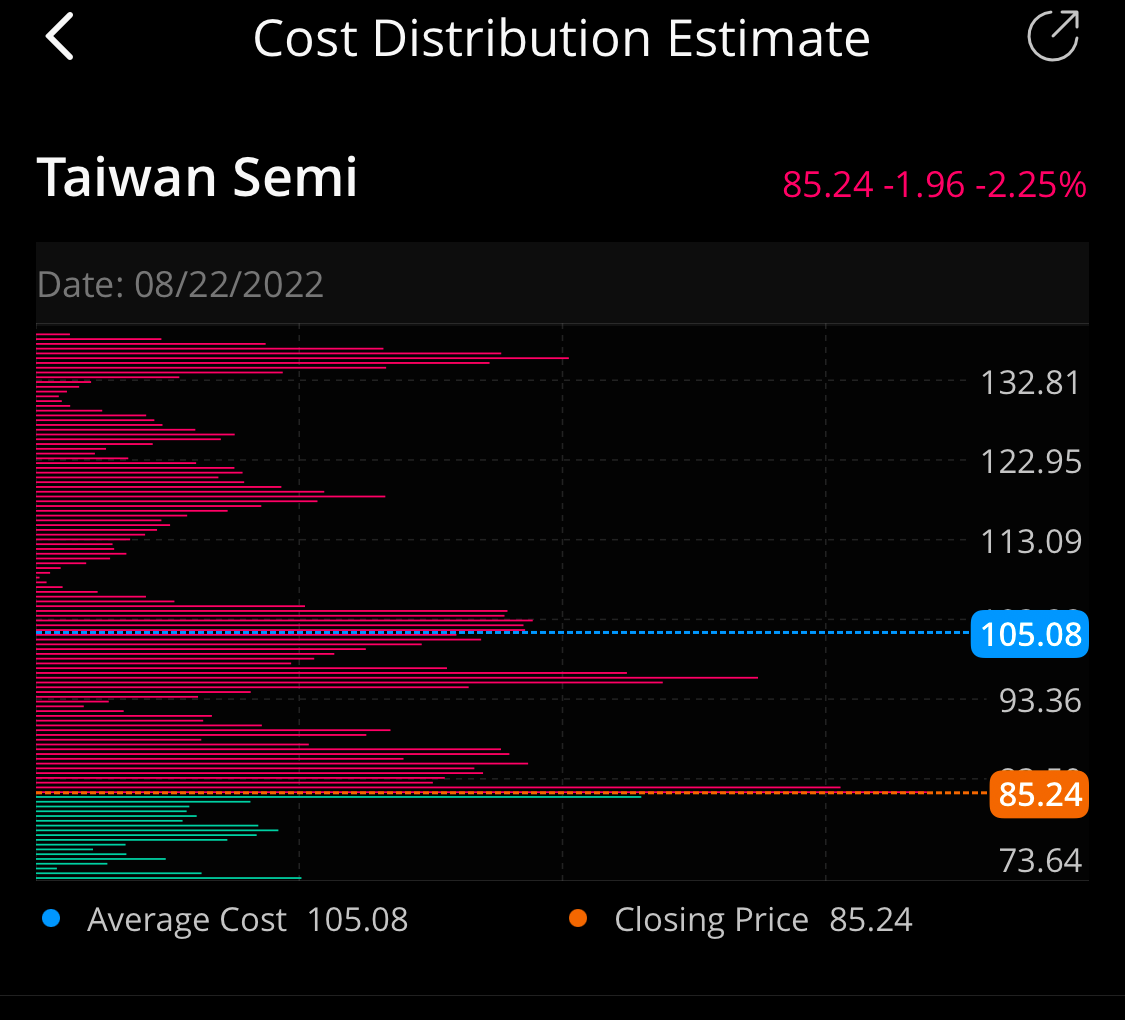 TSMC 투자자들의 평균 매물대는 $ 105.08에 형성 되어 있어 tsmc 투자자들은 평균 20%정도 손실을 보고 있는것으로 보여 신규진입하기 매력적인 가격대로 판단한다.