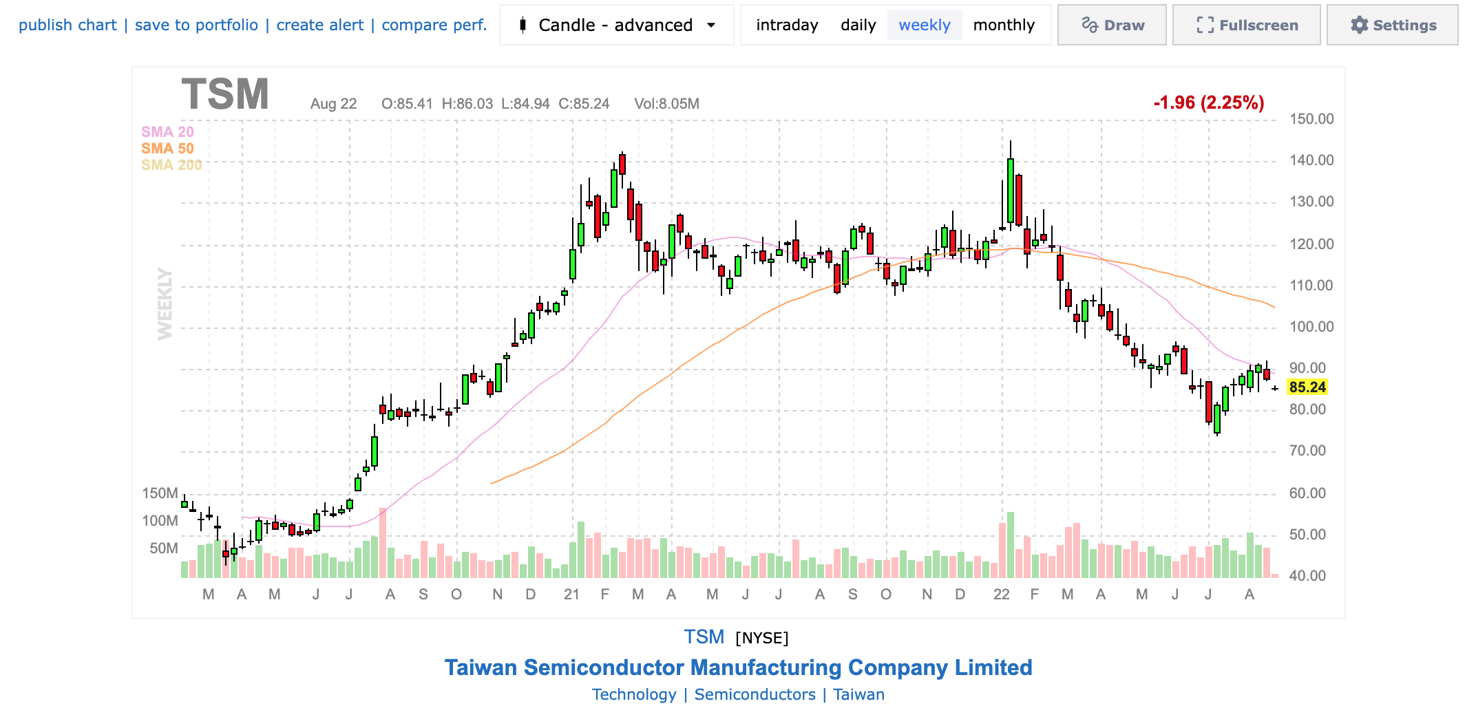 TSMC 주가는 52주 신고가 대비 41% 빠져 있는 상황으로 2022년 8월 23일 기준 $ 85.24를 기록하고 있다. 볼린저 밴드 중하단에 있고 RSI 42를 기록하고 있어 현주가는 과매도권인 것으로 보여진다.