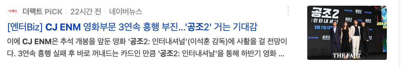 이에 CJ ENM은 추석 개봉을 앞둔 영화 '공조2: 인터내셔널'(이석훈 감독)에 사활을 걸 전망이다. 3연속 흥행 실패 후 바로 꺼내드는 카드인 만큼 '공조2: 인터내셔날'을 통해 하반기 영화 부문 실적 개선을 기대한다는 방침이다.