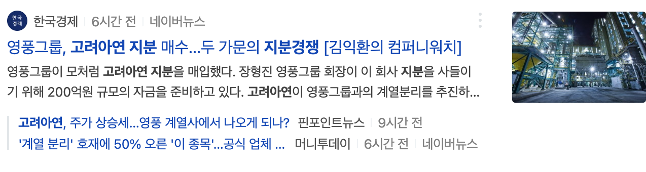 2. 고려아연 지분경쟁 관련주 및 수혜주(영풍그룹주, 영풍그룹 계열분리)