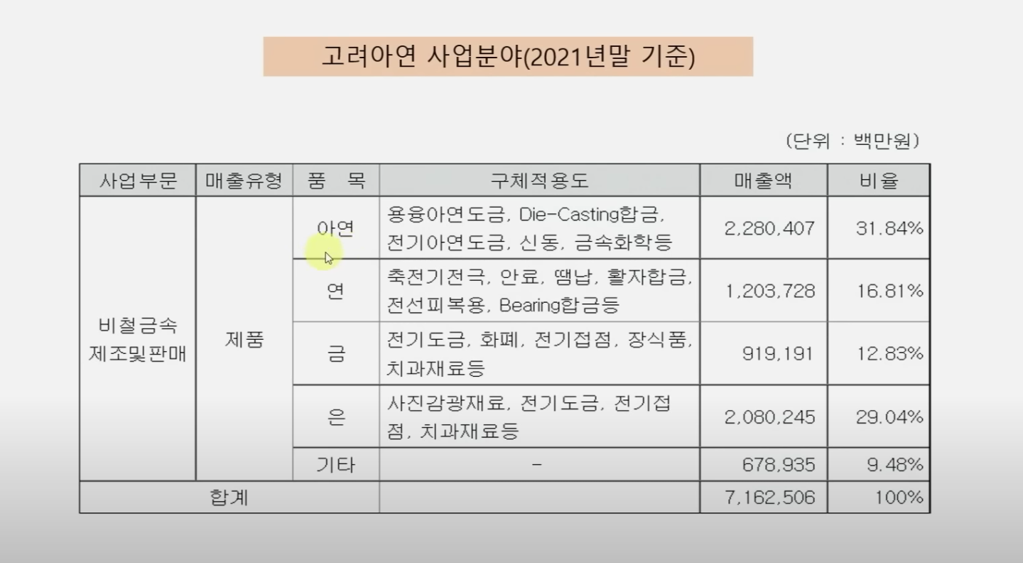 온산제련소에 연제련소 확장이 마무리되어 생산능력 기준 세계 2위 수준으로 입지 향상, 아연괴의 제련과정에서 아연과 연뿐 아니라 금, 은, 인듐 등을 추출해내는 기술력 확보하고 있음.