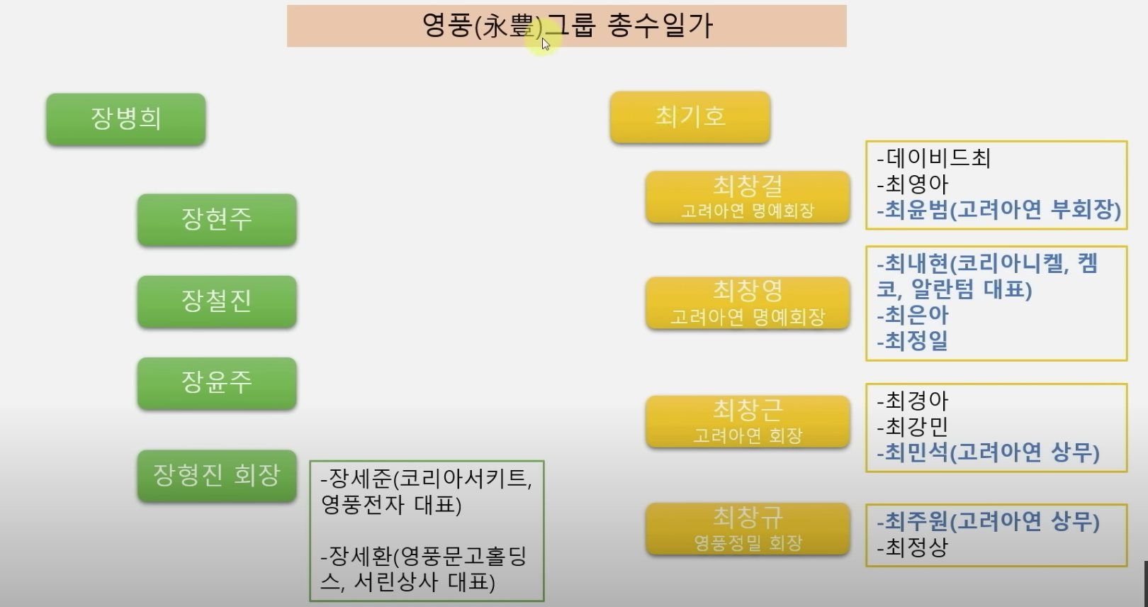 영풍그룹은 장병희 창업주 차남인 장형진 ㈜영풍 회장을 중심으로 장 씨 일가가 사실상 그룹을 지배하고 있다. 최기호 창업주 일가는 전 세계적인 배터리시장 성장에 따라 핵심 소재기업으로 급부상한 고려아연 계열을 맡고 있다. 최기호 창업주 장남 최창걸 고려아연 명예회장의 차남인 최윤범 고려아연 부회장이 작년부터 대표이사로 회사를 이끌고 있다. ㈜영풍은 고려아연 최대주주다.