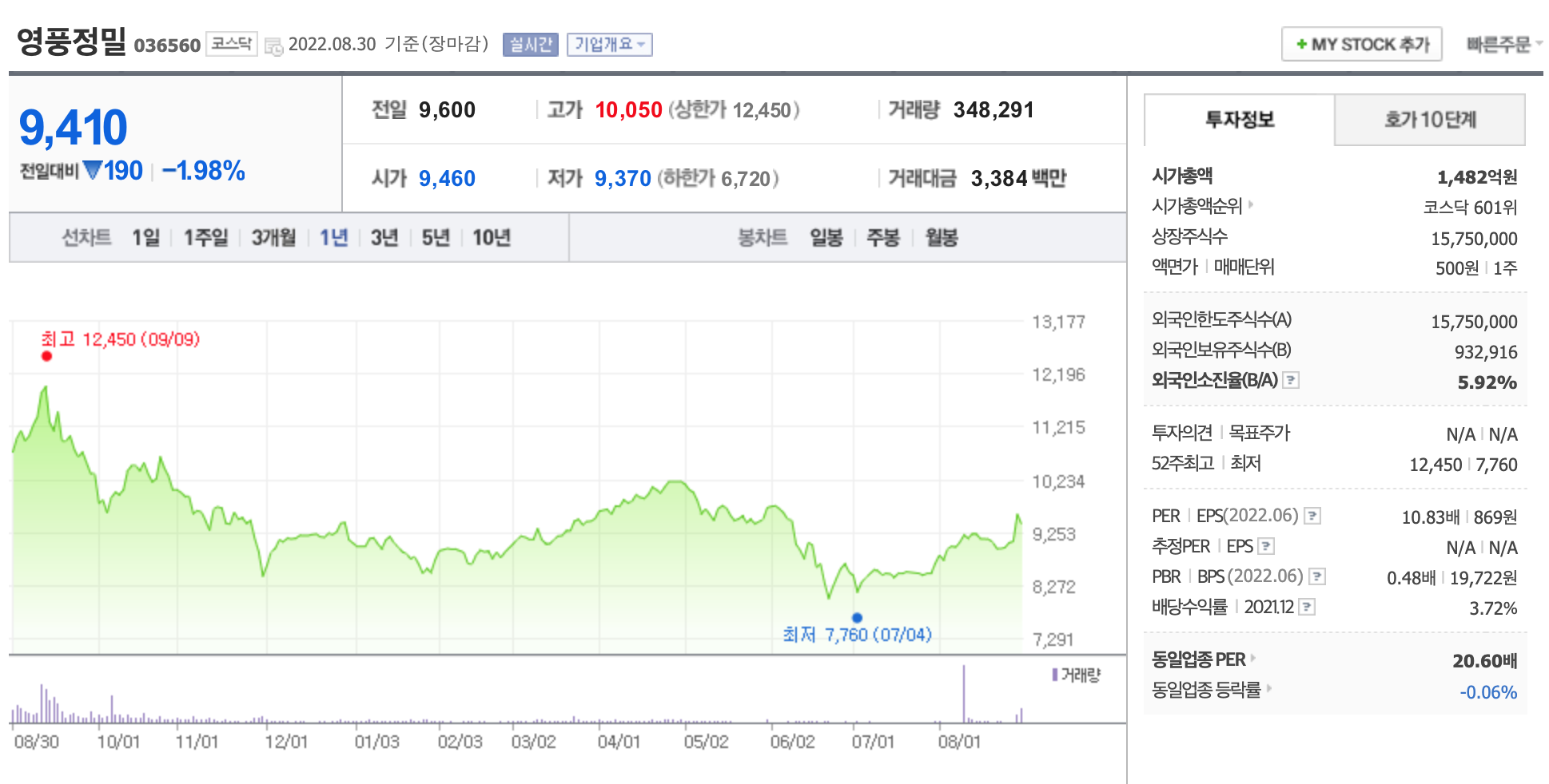 영풍정밀은 고려아연 지분을 1.56% 보유하고 있는데 2022년 8월 30일 시점 영풍정밀의 고려아연 지분가치는 295,110주 * 619,000원 = 1826억원으로 영풍정밀 시총대비 1.23배 크기이다. 영풍정밀은 사업회사이지만 간접지배하고 있는 고려아연 지분가치를 50% 할인 해보면 0.61배로 900억 정도 영풍정밀 시총에 이바지 하고 있는것으로 보여진다. 여기에 영풍정밀 PER 10에 부여하고 작년 영업이익 85억 기준을 통해 계산하면 850억정도 수준인데 이를 합치면 1750억 정도 수준이 된다.