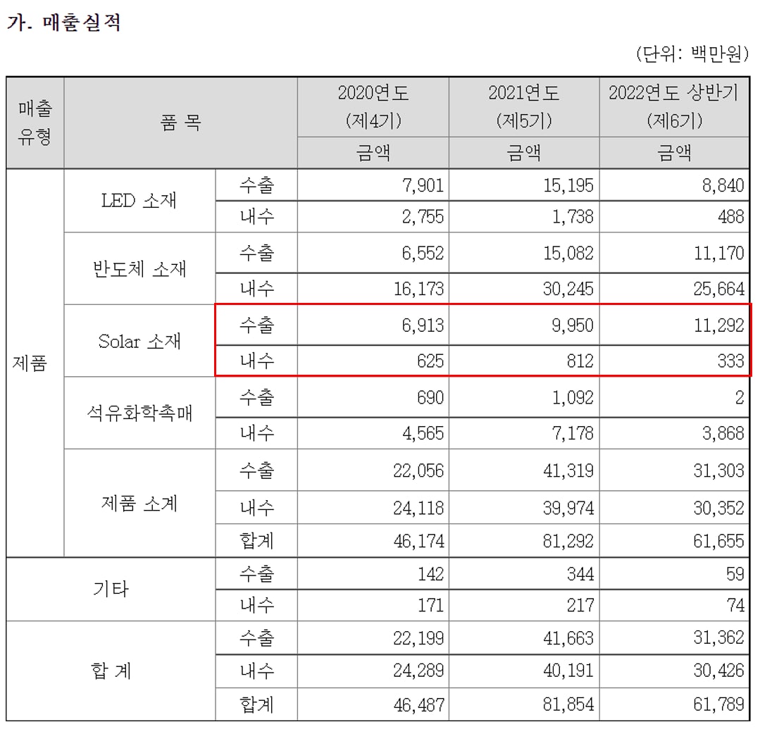 - 전방 반도체 산업의 호조로 반도체 소재 수주가 증가한 가운데, 미니 LED 소재 판매 증가, 석유화학촉매 부문과 태양광 부문 수주 증가로 전년대비 큰 폭의 매출 성장.