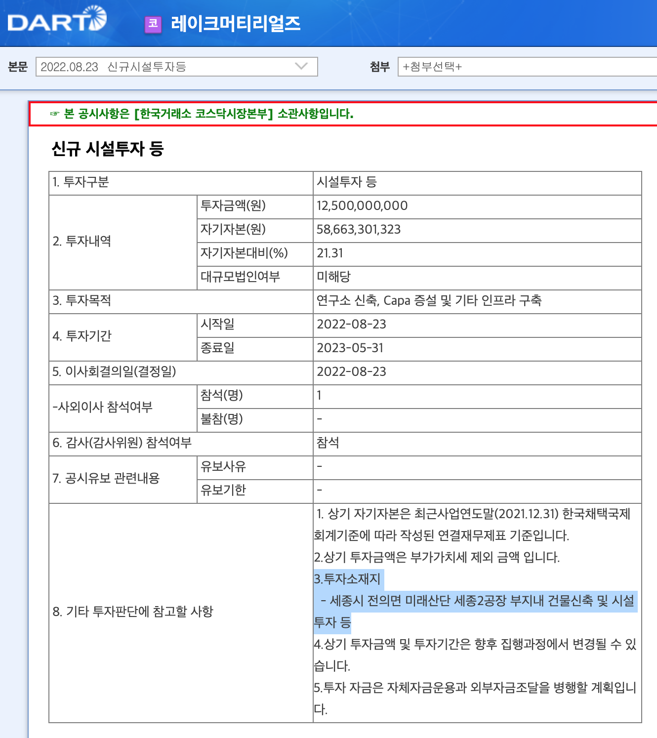8월 23일 신규시설투자 공시를 했다. 투자 목적은 연구소 신축 및 반도체/촉매 캐파 확대로 파악된다. 연초 공시했던 자회사의 TMA 캐파 확대에 이은 추가 투자다. 신규 투자 캐파 반영 시 23년말 금액 기준 캐파는 1,700~1,800억 수준일 것으로 추정된다.