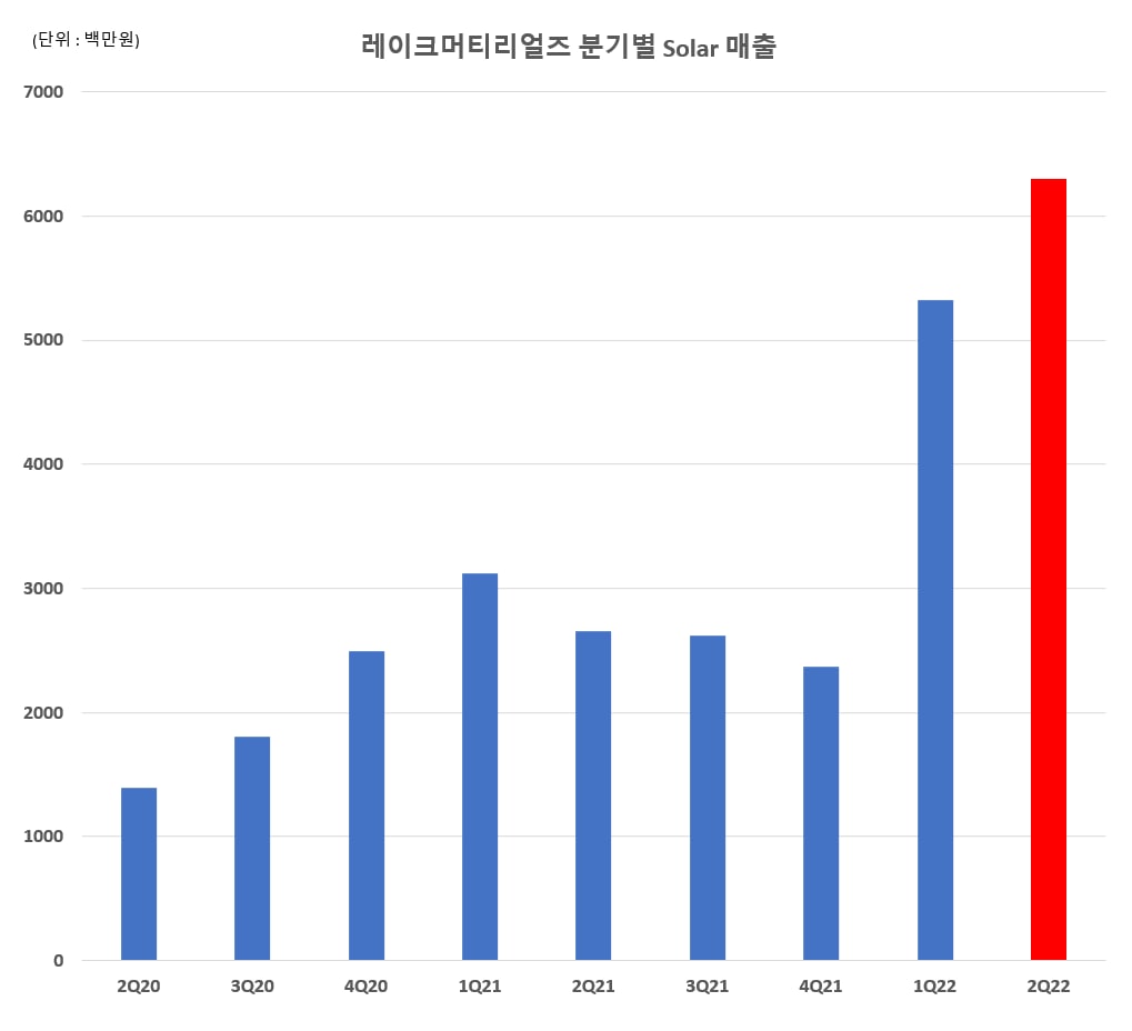 에너지 부족을 겪고 있는 독일에서 가스에너지 부족 문제를 해결하기 위해 가장 빠른 해결책으로 태양광으로 눈으로 돌린상황이라 태양광 관련주로 분류되는 레이크머티리얼즈의 경우 본격적으로 추위가 시작되는 올 연말까지 주가 흐름에 긍정적으로 작용할 것으로 예상된다.