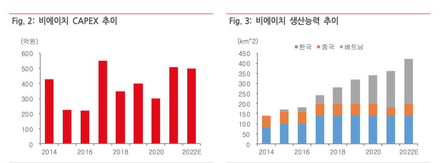 비에이치는 IT 산업의 핵심부품인 FPCB(연성인쇄회로기판)를 전문 생산하는 국내 최대 업체이다. 일반 PCB가 무게, 부피 및 경직성으로 인한 한계성을 가지는 반면, FPCB는 IT제품의 경박 단소화 추세에 맞춰 응용 범위가 확대되며 고성장 추세에 있다. 동사는 매년 4백억원 규모의 설비 투자를 통해 생산능력을 증대 시키고 있으며, 올해 예상 생산능력은 양면 기준 월 420km2(국내 1~2공장 140km2, 베트남 1~4공장 220km2, 중국 공장 60km2)이다. 1H22 기준 매출 구성은 Display FPCB 88%(북미 고객 향 71%, 삼성 및 중국 고객 향 17%), 5G 안테나 FPCB 4%, 스마트폰 보호회로(PCM)용 FPCB 4%, 전기차 배터리용 FPCB 2%, 기타 2%로 나뉜다.