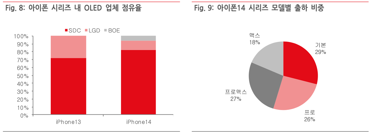 경쟁사 삼성전기의 RF-PCB 사업 철수와 또 다른 경쟁사의 생산 수율 문제로 인해 북미 전략 고객사 내 동사 점유율은 연초 50% 수준에서 현재 80% 이상까지 올라온 것으로 추정 된다. 또한 아이폰13부터 일부 적용된 LTPO(Low Temperature polycrystalline Silicon) 기판 기술이 아이폰14(프로/프로맥스 모델)에도 적용되는데, 새로 진입하기로 한 국내 패널 업체가 생산 수율 문제로 진입이 늦어지면서 아이폰14 시리즈 공급망 내 삼성디스플레이의 시장 점유율이 더 상승한 것으로 파악된다. 시장조사기관 디스플레이서플라이체인컨설턴트(DSCC) 발표 자료에 따르면, 6~9월 아이폰14 시리즈 OLED 패널 점유율은 삼성디스플레이 82%, LG디스플레이 12%, BOE 6% 이다. 작년 아이폰13 공급망과 비교하여 삼성디스플레이 점유 율이 10%pt 가량 상승한 것으로 나타난다.