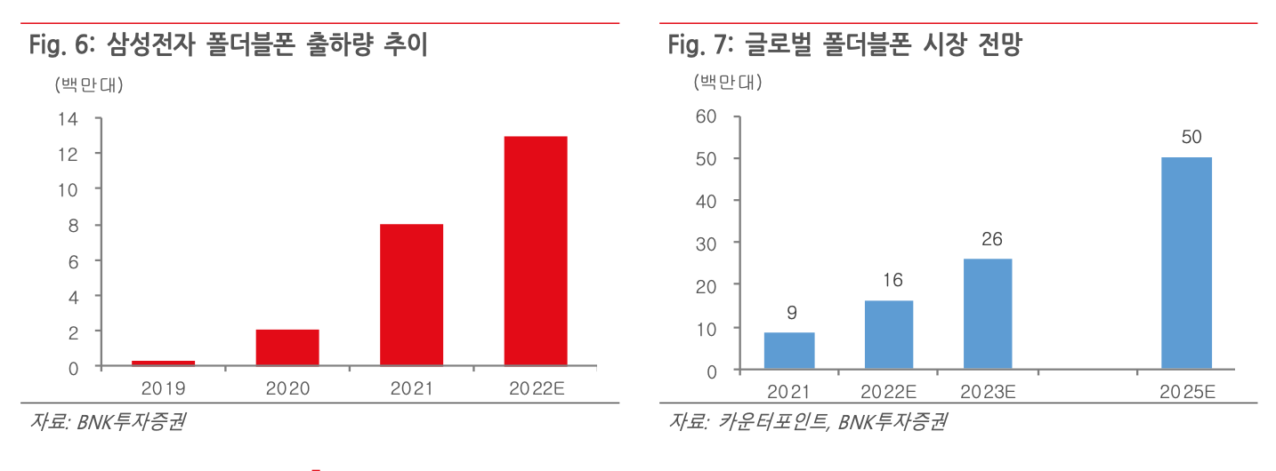 9월 출시 예정인 아이폰14의 경우, 글로벌 경기 둔화 추세와 가격 인상에 따른 부정적 영향 우려에도 불구하고, 부품사가 느끼는 주문량은 최소 아이폰13 이상이다. 또한 국내 고객사 폴더블폰의 경우, 올해 1천 5백만대 생산이 예상 되는데, 이는 작년 7.5백만대 대비 2배 증가하는 것이다. 더구나 폴더블폰은 내부와 외부창 2개가 있기 때문에 스마트폰 3천만대 규모와 같은 효과다. 내년에는 약 2천만대 생산이 예상 되어, 국내 고객사의 전체 스마트폰 판매 정체에도 불구하고 동사가 받는 주문량은 견조할 전망이다.