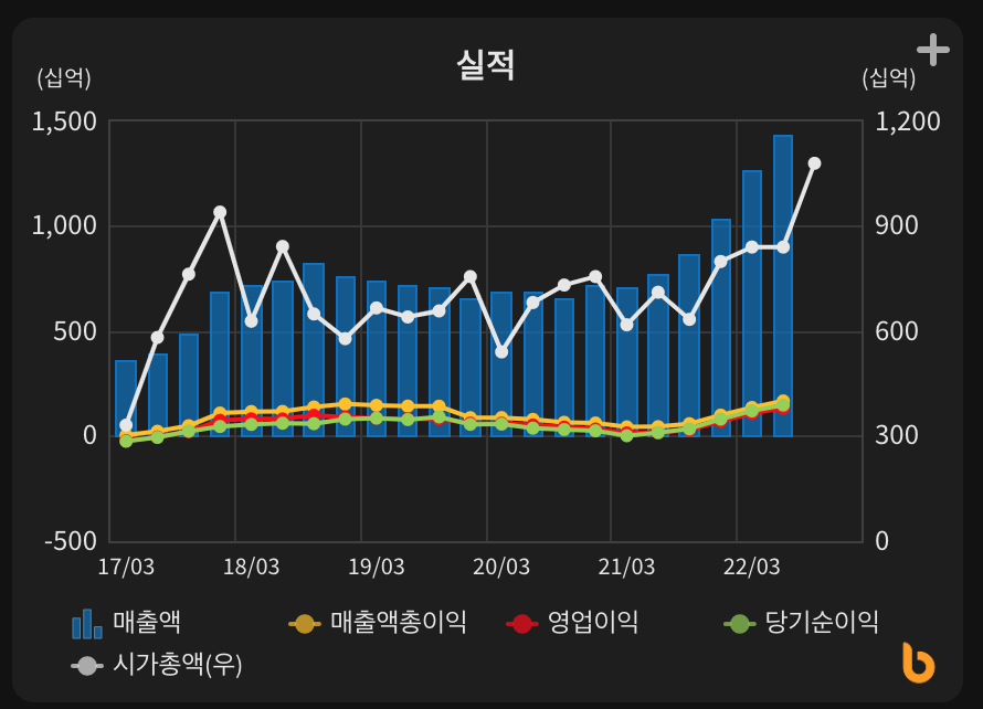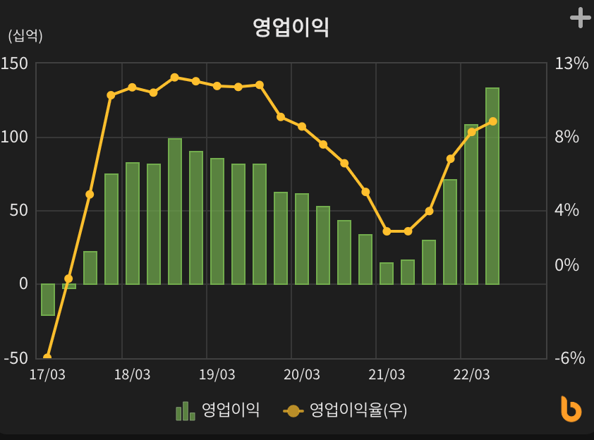 2017년 북미 고객 공급망에 신규 진입하면서 동사 매출이 86% 급증한 이후, 작년에는 44% 급증에 이어 올해도 매출이 51% 증가할 전망이다. 작년에는 북미 고객 OLED 모델 수가 4개로 확대된 때문이며, 올해는 아이폰13 시리즈 판매가 계속 호조를 보임과 삼성전기 사업 철수에 따른 반사이익, 아이폰14 시리즈 공급망 내 삼성디스플레이 점유율 상승 등이 복합적 으로 호재로 작용했다. 내년에는 북미 고객 향 매출이 둔화되더라도 무선 충전기 신규 사업 매출 2천 1백억원 추가와 국내 고객 폴더블폰 성장 지속으로 18% 매출 성장이 예상되며, 2024년에는 북미 고객 IT기기 OLED 채택에 따라 31% 성장을 예상한다. 한편 올해 영업 이익은 1,521억원으로 역대 최대를 기록할 전망이다.