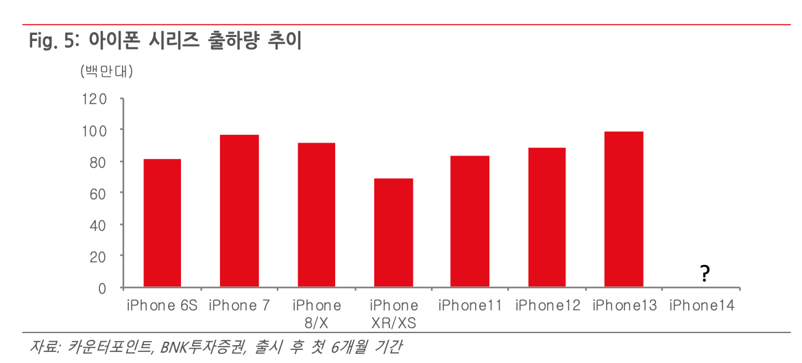 초기 생산 차질 이슈에도 불구하고 아이폰13 시리즈는 역대 최대 판매 실적을 기록하고 있다. 글로벌 스마트폰 시장 침체에도 불구하고 프리미엄 스마트폰 수요는 여전히 탄탄하다. 북미 고객사로부터 추가 수요 증가로 인해, 상반기 출하 목표 대비 실제로는 2배 이상 증가했다.