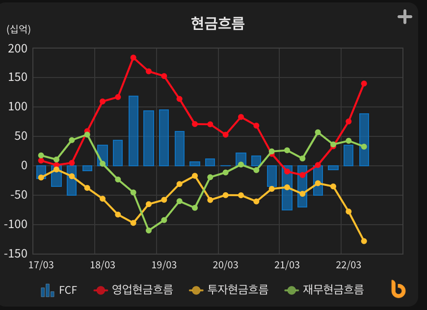 비에이치 부채비율 최근 5년간 최하단인 75% 정도, FCF 90억원대로 양호한 상태