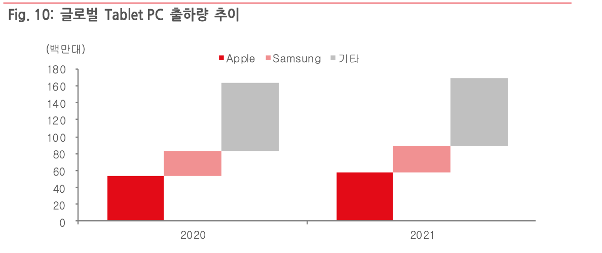 스마트폰에 한정되었던 중소형 OLED 시장은 향후 노트북, 테블릿, 차량용 디스플레이 등 중형 사이즈 시장으로 확대될 전망이다. 최근 삼성디스플레이가 노광기 투자에 들어갔는데, 설비가 완공되는 내년 하반기부터 본격 IT기기 향 OLED 생산 확대가 예상된다. 앞서 삼성 디스플레이가 2024년부터 유럽차에 차량용 OLED를 공급할 것이라는 언론 보도가 있었다. 또한 애플이 2024년부터 아이패드 일부 모델과 맥북에 OLED를 탑재할 예정인데, 스마트폰과 비교하여 아이패드는 면적이 4배 정도 크고, 단가도 높기 때문에 FPCB 업체에는 상당한 호재다. 2021년 기준 애플의 아이패드와 노트북 출하량은 각각 5천 8백만대, 2천 5백만대 규모였다.