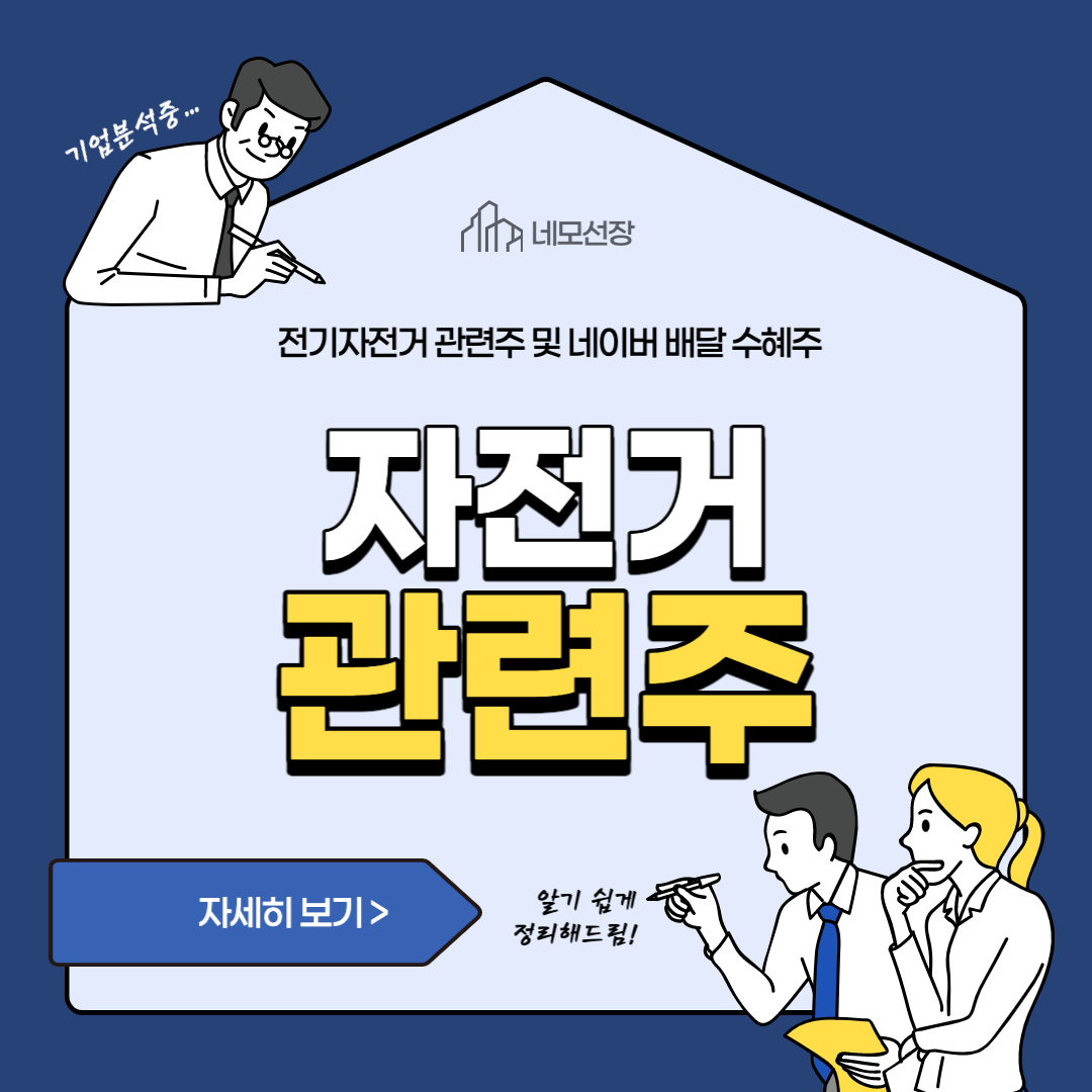 위 같은 사실을 종합했을때 자전거 관련주, 전기자전거 관련주, 네이버 배달 시장 진출 관련주가 앞으로 시장에서 지속적으로 주목받을것으로 예상돼 아래에 정리해 보았습니다.