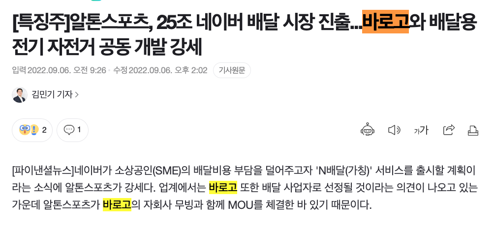 업계에서는 바로고 또한 배달 사업자로 선정될 것이라는 의견이 나오고 있는 가운데 알톤스포츠가 바로고의 자회사 무빙과 함께 MOU를 체결한 바 있기 때문이다. 네이버는 배달앱 연동 개발을 완료한 상태다. 빠르면 11월 N배달 서비스를 론칭할 것이라는 설명이다.