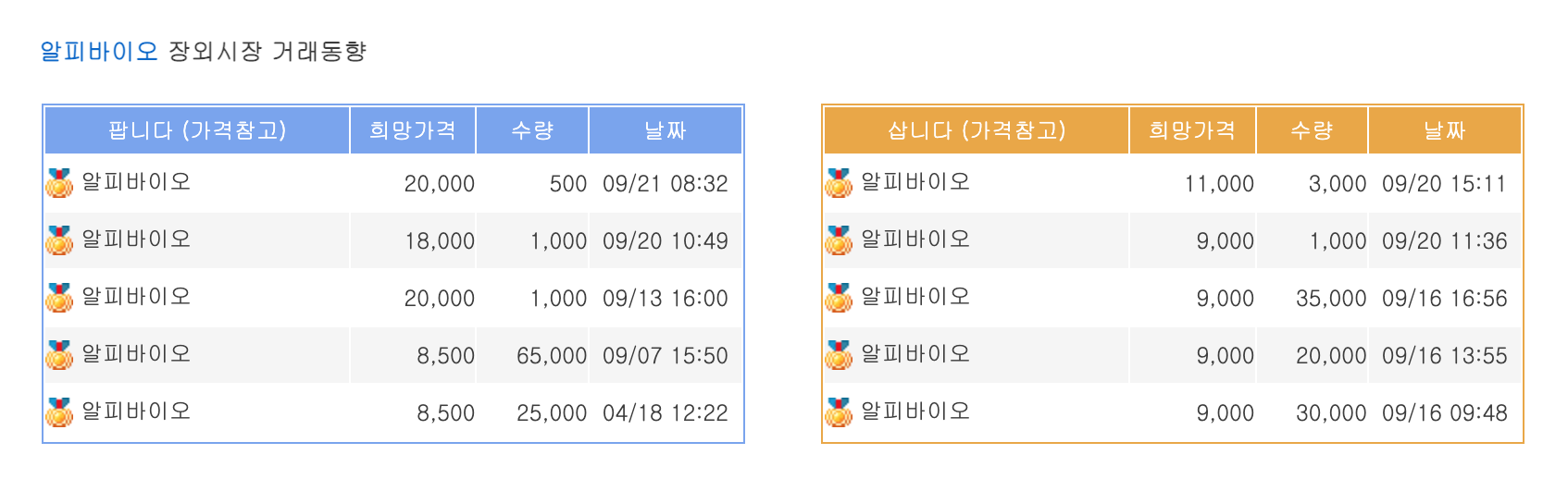 알피바이오 장외시장 거래동향을 보면 매도자 물량은 8,500원에서 20,000원대에 형성되어 있고 매수자 희망 호가는 9,000원대에서 11,000원 사이에 장외가가 형성되어 있습니다.