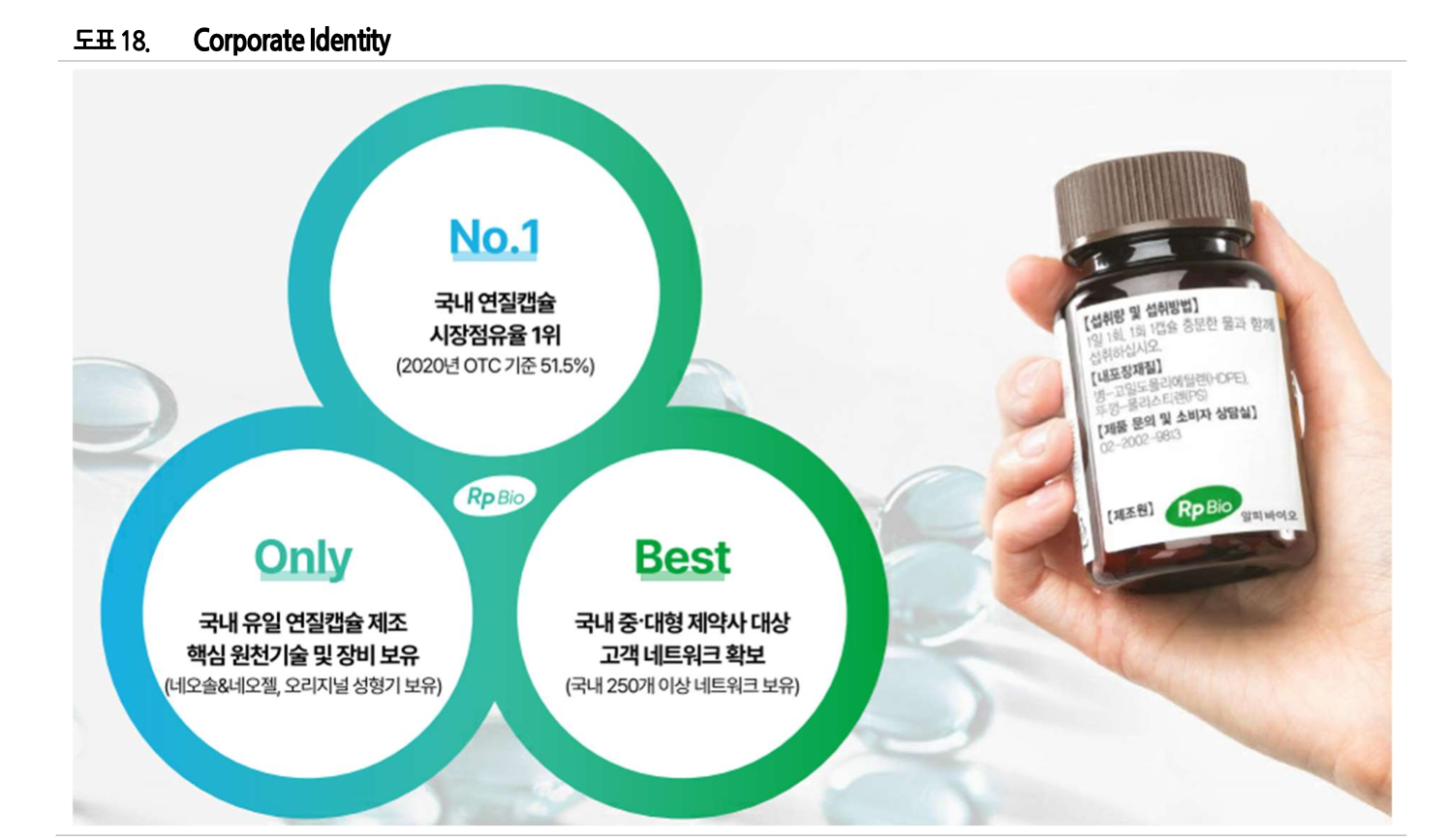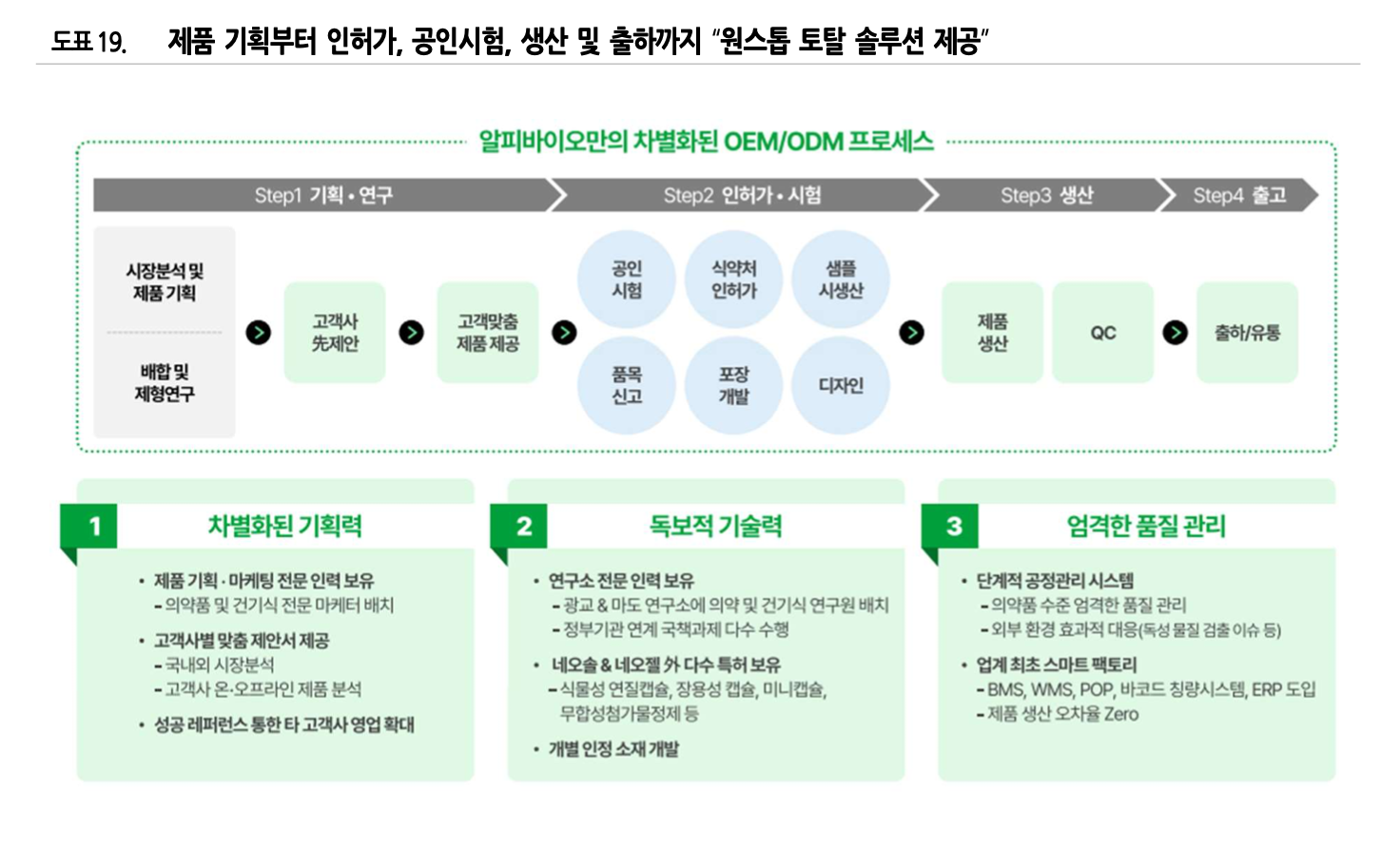 연질캡슐(Soft Capsule) 분야 세계 1위 기업인 R.P. Scherer사의 혁신적인 원천기술을 이어받은 국내 유일회사로 의약 품과 건강기능식품을 제조, 생산하는 OEM (Original Equipment Manufacturing, 주문자 상표 부착생산), ODM((Original Development Manufacturing, 제조업자 자체개발생산) 업체임. 알피바이오는 9월 29일에 코스닥 시장에 신규 상장 예정임. 제품별 매출비중(2021 년 별도 기준)은 건강기능식품 65.2%, 의약품 34.4%, 기타 0.4%.