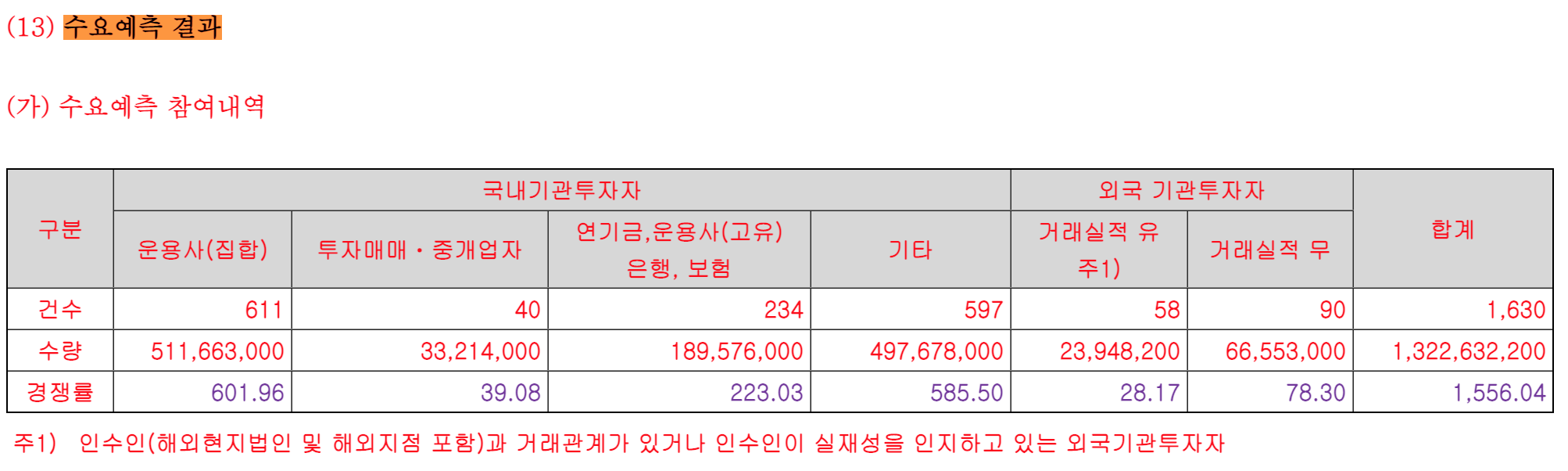 알피바이오 수요예측에는 총 1630곳에 달하는 기관투자자들이 참여해 1556.04대 1의 경쟁률을 기록했습니다. 회사 측은 수요예측 신청 수량 중 99.55%(미제시 1.16%포함)가 공모가 희망밴드 최상단인 1만3000원 이상을 제시했음에도 시장친화적인 가격으로 공모가를 최종 확정했다고 설명했습니다.