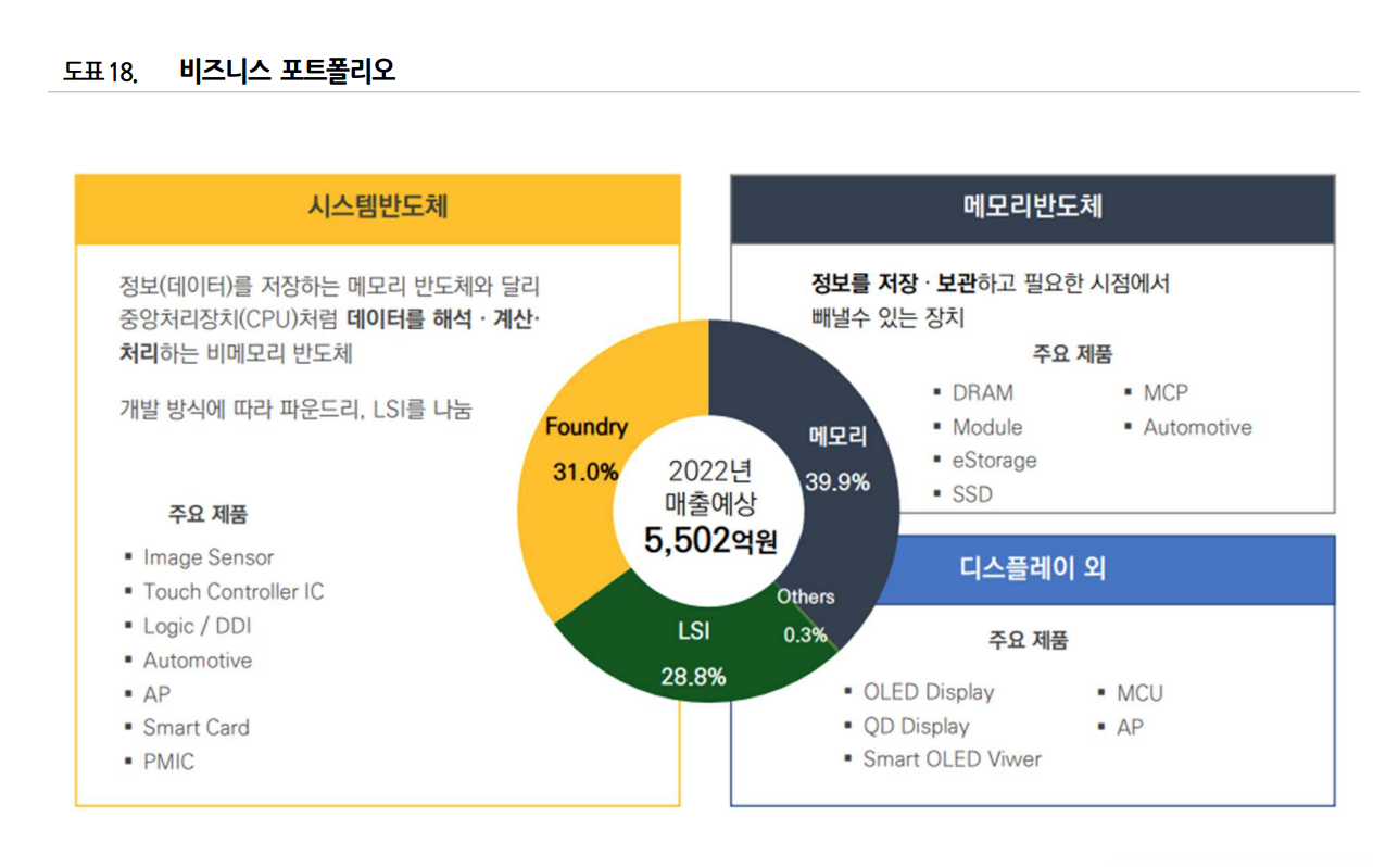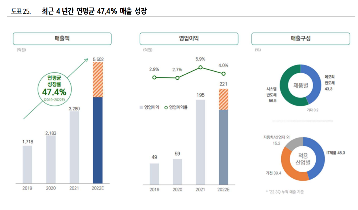 - 2022년 3분기 누적 기준 상품별 매출 비중은 메모리 43.2%, 시스템반도체 56.4% 등. 2021년 8월과 2022년 4월에 시스템반도체 신규 거래처가 추가되며 시스템 반도체 매출 및 비중 증가