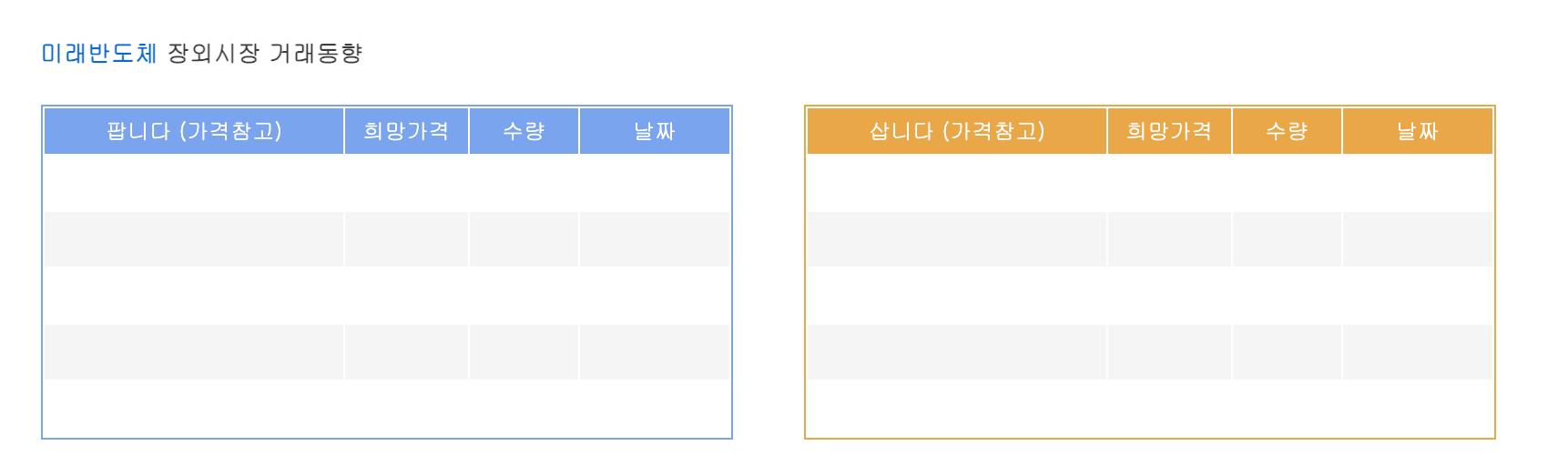 미래반도체 장외시장 거래동향을 살펴보면 미래반도체 장외가가 존재 하지 않아 파악이 어려운 상황입니다.