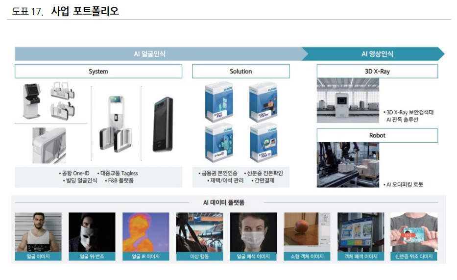 AI Vision 중 얼굴인식 분야를 집중 개발하여, 글로벌 얼굴인식 분야에서 최고의 공신력을 얻고 있는 NIST(National Institute of Standards and Technology, 미국 국립표준기술연구소)의 FRVT(Face Recognition Vendor Test) 5개 부 문에서 글로벌 1위를 달성하는 높은 인식률을 보유. 주요 매출비중(2022년)은 AI 얼굴인식 시스템 66.3%, AI 얼굴인식 솔루션 1.1%, AI 객체인식 솔루션 9.8%, AI 데이터관리 솔루션 14.9%, 기타 매출 8.0%를 차지함.