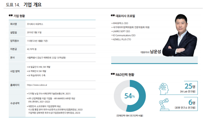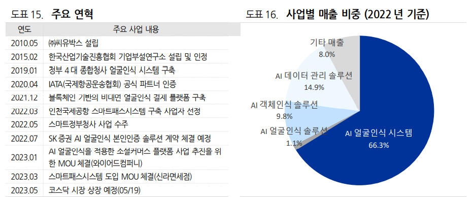 2010년 ㈜씨유박스 설립, 씨유박스는 AI(Artificial Intelligence, 인공지능) 비전인식 알고리즘 개발, AI 학습데이터 구축/ 가공/정제, AI 얼굴인식 관련 소프트웨어 및 하드웨어 설계 및 개발을 하는 AI 전문기업. 코스닥시장 상장 요건 중 기술성장기업(기술특례상장)으로, 2023년 5월 19일에 코스닥시장에 상장 예정임.