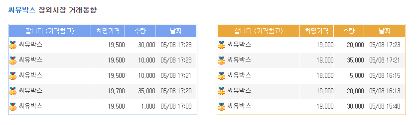 씨유박스 장외시장 거래동향을 살펴보면 씨유박스 매도 장외가는 19,500원 ~ 19,700원 사이에 형성되어 있고 매수 장외가는 18,000원 ~ 19,000원 사이에 형성되어 있습니다.