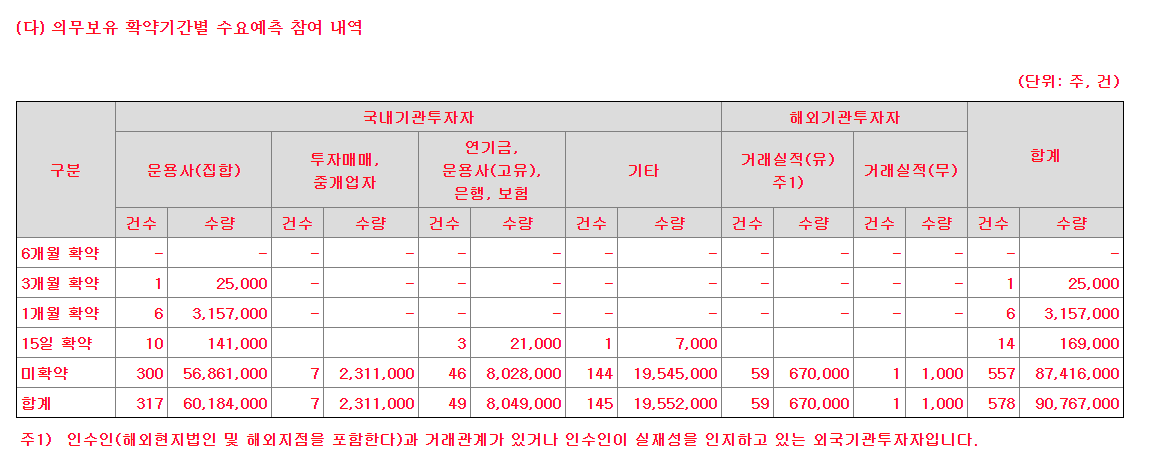 또한, 대다수 기관들이 씨유박스 공모주를 배정받은 뒤 일정 기간 팔지 않겠다고 약속하는 의무보유 확약을 신청하지 않았다. 의무보유 확약 비율이 낮다는 것은 상장 이후 기관 물량이 대거 쏟아질 수 있다는 것을 뜻한다. 씨유박스 의무보유 확약건수는 3.63%, 신청 수량으로는 3.69%에 그쳤다.