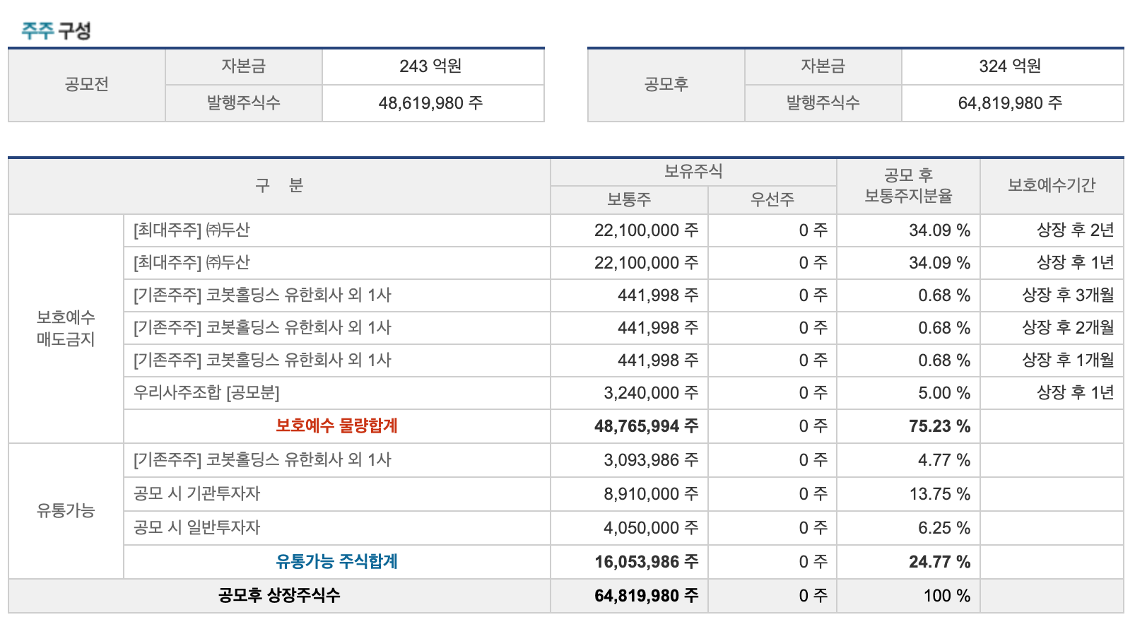 두산 로보틱스 공모주 유통가능 주식물량은 상장 당일 전체물량의 24.77%이며 타 종목과 상장시 유통가능 주식수가 비슷한 편이라 주가흐름 변동성이 유사할 것으로 예측됩니다.