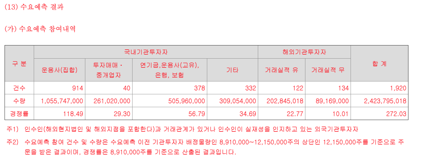 이번 두산 로보틱스 수요예측에는 국내외 1920개 기관이 참여해, 24억 2379만 5018주를 신청했습니다. 경쟁률은 272대1, 공모금액은 약 4212억원, 상장 후 시가총액은 약 1조6853억원 규모가 될 전망입니다. 공모금액과 더불어 수요예측 참여주식수를 공모가격으로 환산 시 수요예측 참여금액이 약 63조원에 달할 전망으로 올해 현재까지 최대 규모 딜입니다.