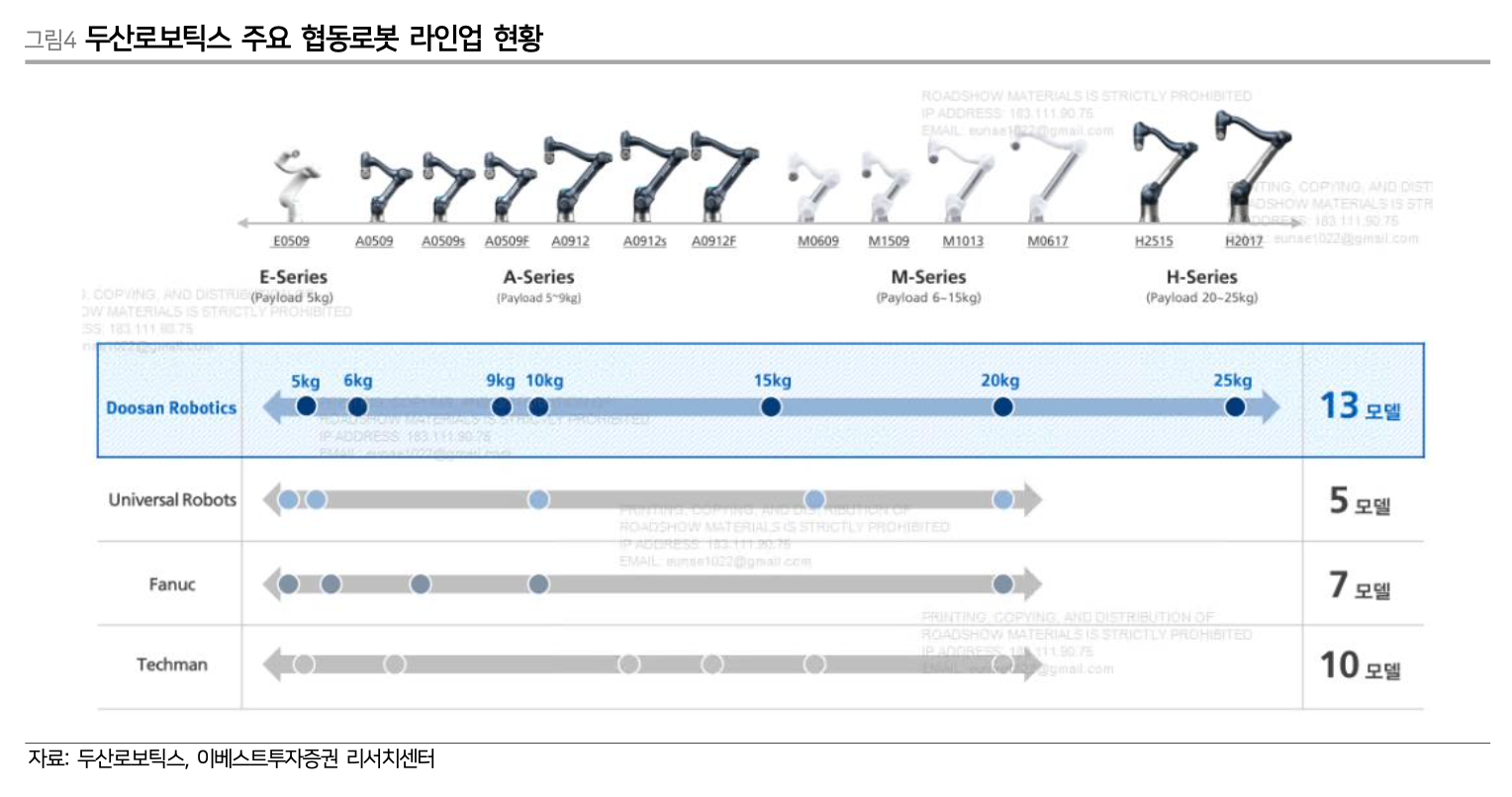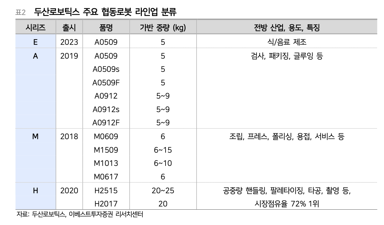 두산로보틱스는 2018년 협동로봇 양산을 시작하여, 글로벌 동종업체 내 가장 많은 13종(E시리즈 1종, A시리즈 6종, M시리즈 4종, H시리즈 2종)의 SKU를 보유하고 있다. 특히, 현존하는 협동로봇 중 가장 무거운 중량을 운반할 수 있는 H시리즈(가반하중 20~25kg)를 전세계 최초로 출시하면서, 가반하중 5~25kg를 모두 커버하는 라인업을 완성했다.