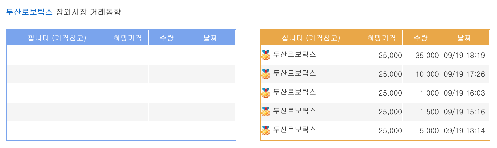 두산로보틱스 장외시장 거래동향을 살펴보면 두산로보틱스 매도 장외가는 없고 매수 장외가는 25,000원에 형성되어 있습니다.
