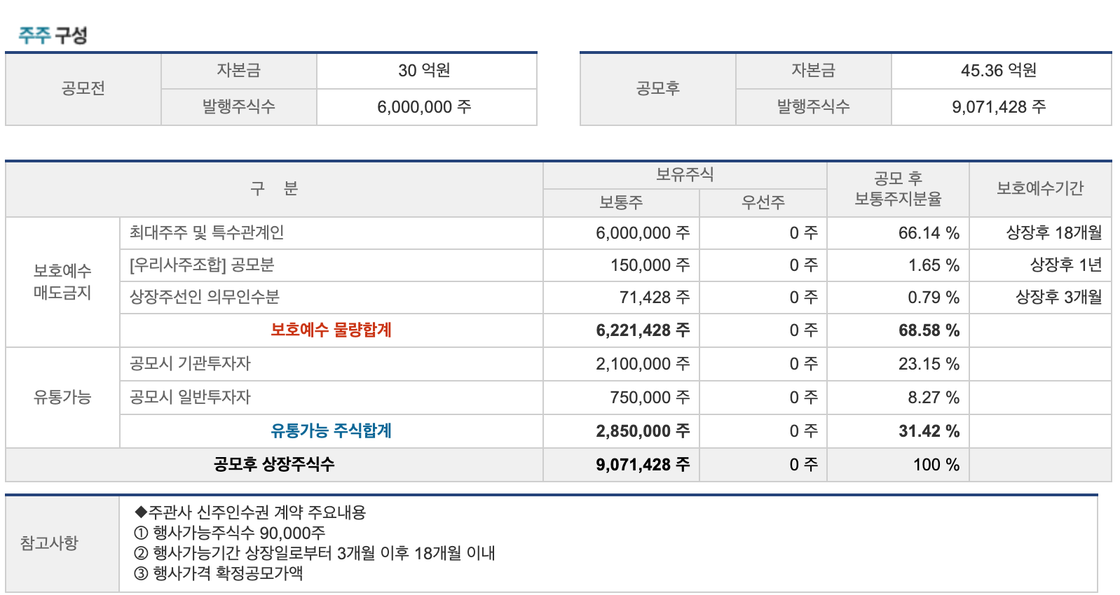 이닉스 공모주 유통가능 주식물량은 상장 당일 전체물량의 31.42%이며 타 종목과 상장시 유통가능 주식수가 비슷한 편이라 주가흐름 변동성이 유사할 것으로 예측됩니다.