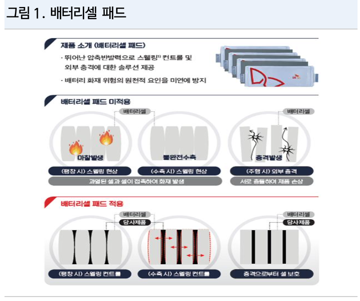 - 2023년 3분기 누적 기준 매출 비중은 배터리셀 패드 40.9%, 테이프 11.5%, 기타제품 9.9%, 상품 37.6% 등