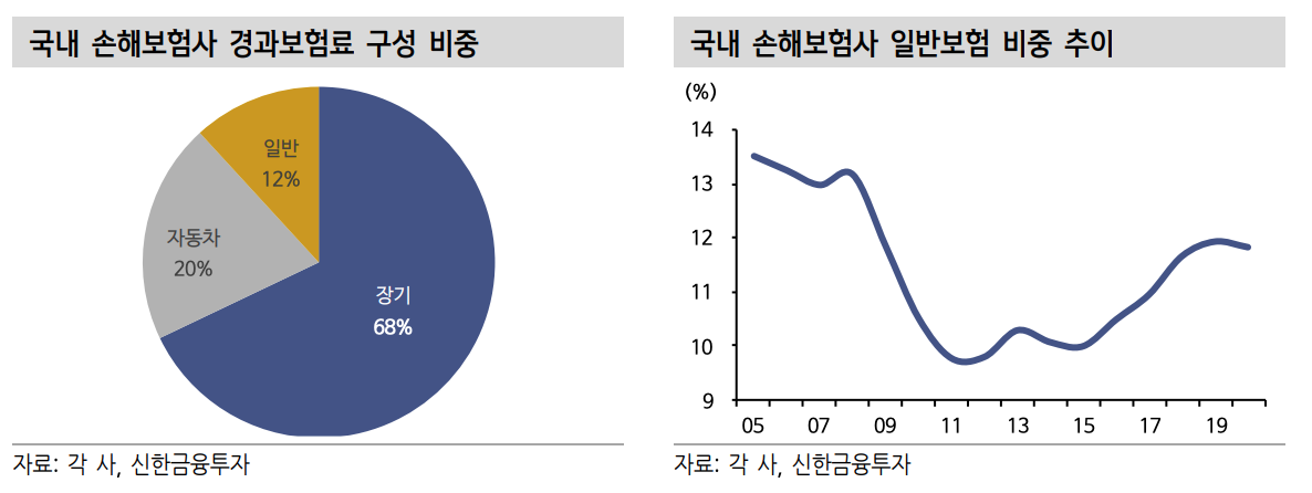 현재 국내 손해보험사들의 원수보험료 중 일반보험이 차지하는 비중은 12% 수준에 불과하다(2020년 기준). 전통적 보험사들은 장기보험 중심의 영업을 지향하며 일반보험은 장기보험만큼 경쟁이 치열하지 않다. 따라서 전략적으로 카카오 손해보험은 사업 초기에 일반보험을 중심으로 보험시장에 침투하고 중장기적으 로 건강·상해 등 장기보험과 자동차보험 시장까지 확장해나갈 것으로 전망된다.