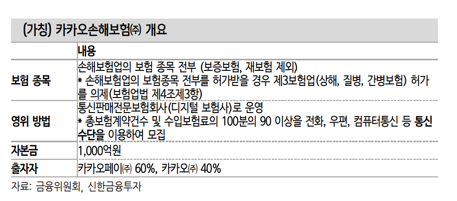 지난 6월 9일 금융위원회가 카카오 손해보험(가칭)의 보험업 영위를 예비 허가했다. 이에 카카오 손해보험은 디지털 보험사로서 보증보험과 재보험을 제외한 손해보험종목을 전부 다룰 수 있게 됐다. 자본금은 1,000억원, 출자자는 카카오페이(60%), 카카오(40%)이며, 6개월 이내에 자본금 출자, 인력 채용 및 물적 설비 구축 등 허가 요인을 이행한 후 본허가를 신청할 수 있다.