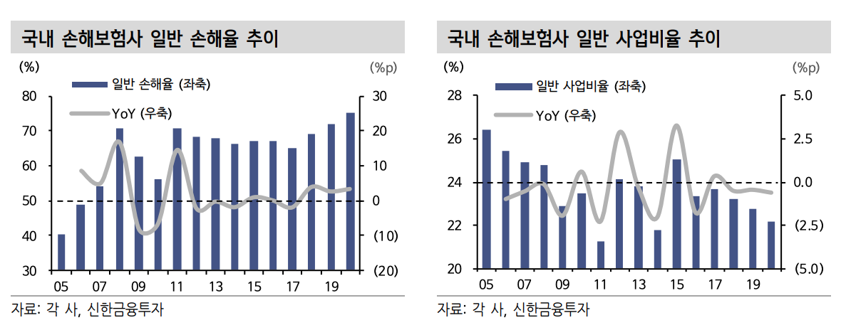 일반보험의 경우 손해율 변동성이 높아 손익 관리가 어려운 한계가 존재해 전통적 보험사들의 대응 방안은 제한적일 전망이다. 카카오손해보험이 성공적으로 시장에 안착할 것으로 기대되는 가운데 향후 전통적 보험사들에 대한 투자 매력도 가 상대적으로 저하될 개연성을 배제할 수 없다. 실손 청구 간소화 법안 통과 등 보험금 증가 억제를 위한 제도적인 변화가 전통적 보험사들의 펀더멘털을 뒷받침할 수 있을 것으로 판단된다.
