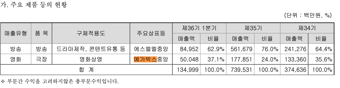콘텐트리중앙은 크게 3개의 사업부문을 운영하고 있다. 계열사관리 등을 주 사업목적으로 하는 지주부문, 미디어 콘텐트를 제작 및 유통하는 방송 부문, 극장 운영과 영화를 제작/투자/배급하는 영화부문으로 이루어져 있다.