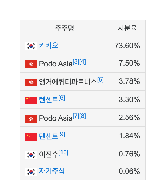 카카오는 초대형주이기 때문에 헌트 관련주로 직접적인 수혜를 받기는 어렵겠지만 헌트 제작에 카카오의 자회사인 카카오엔터테인먼트(전신 카카오M)의 종속회사 사나이픽처스가 참여하여 포함시켰다.