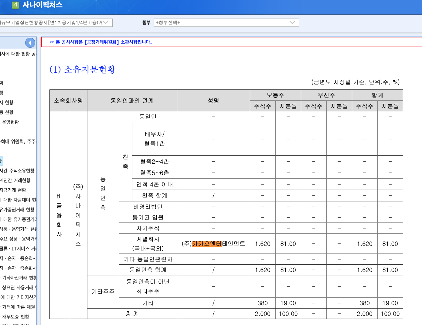 카카오는 카카오엔터테인먼트의 지분을 73.60% 소유하고 있고 카카오엔터테인먼트는 사나이픽처스의 81% 지분을 소유하고 있다.