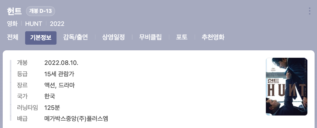 영화 헌트 개봉일 : 2022년 8월 10일(수요일)